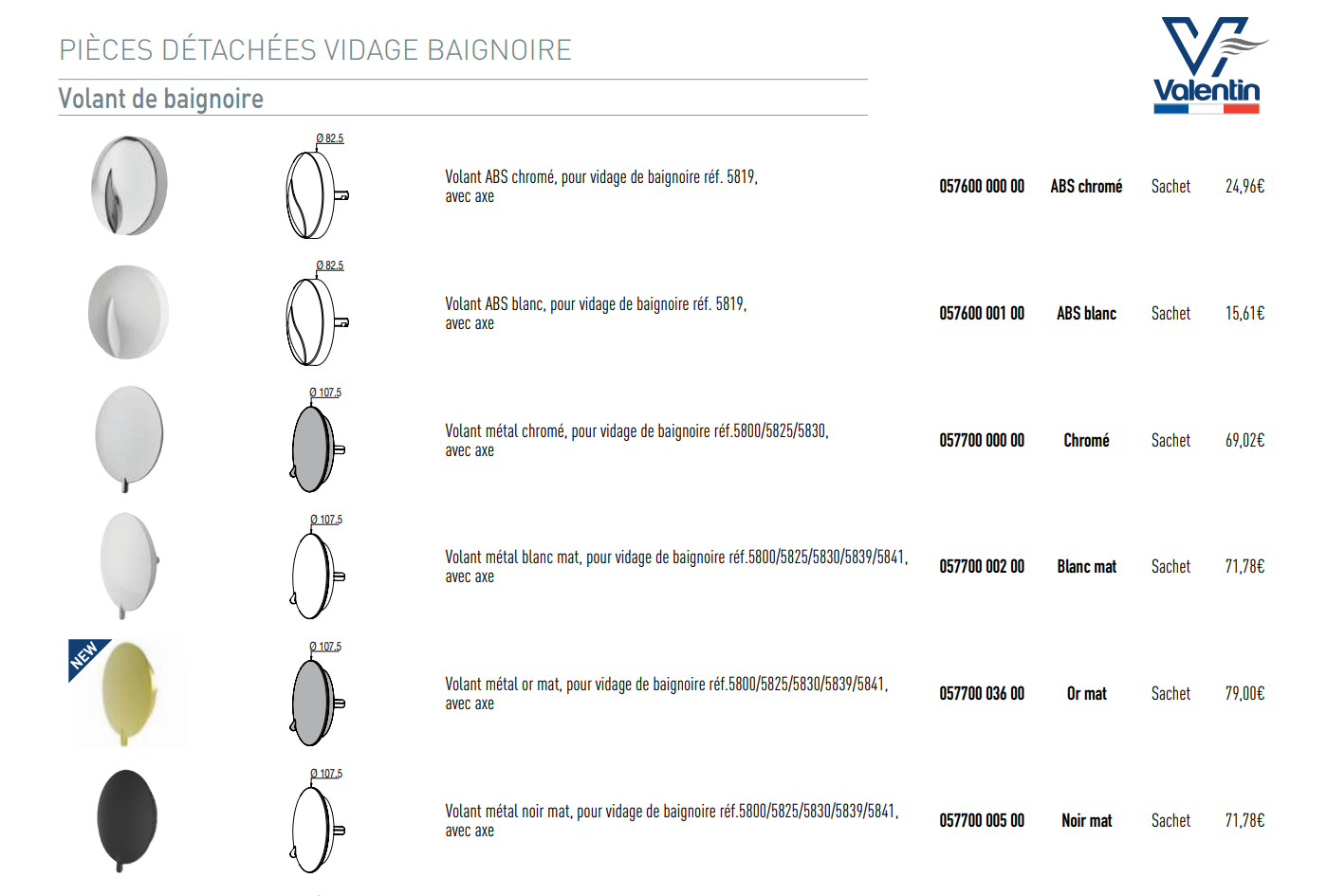 In the “Bath waste spare parts” section, you will find the sub-section “Bath knob”, featuring all the knobs offered by VALENTIN, along with their reference numbers, finishes, packaging and prices.