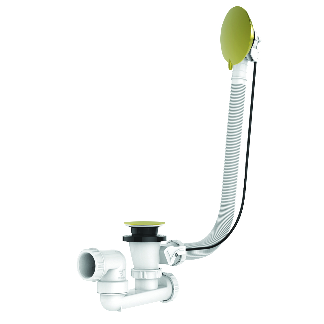 This matte gold bath tub drain made from recycled plastic is part of the VALENTIN gold range. It features a design automatic matte gold metal control knob that opens and closes the matte gold metal cover plug. The 1m cable is highly durable and tested for 1 million operations. It also includes a welded overflow tube, an ABS flange, and a double autofix gasket that holds the drain fitting in place on the bathtub to facilitate installation and ensure a perfect seal. The 360° swivel outlet allows a quick and easy installation.