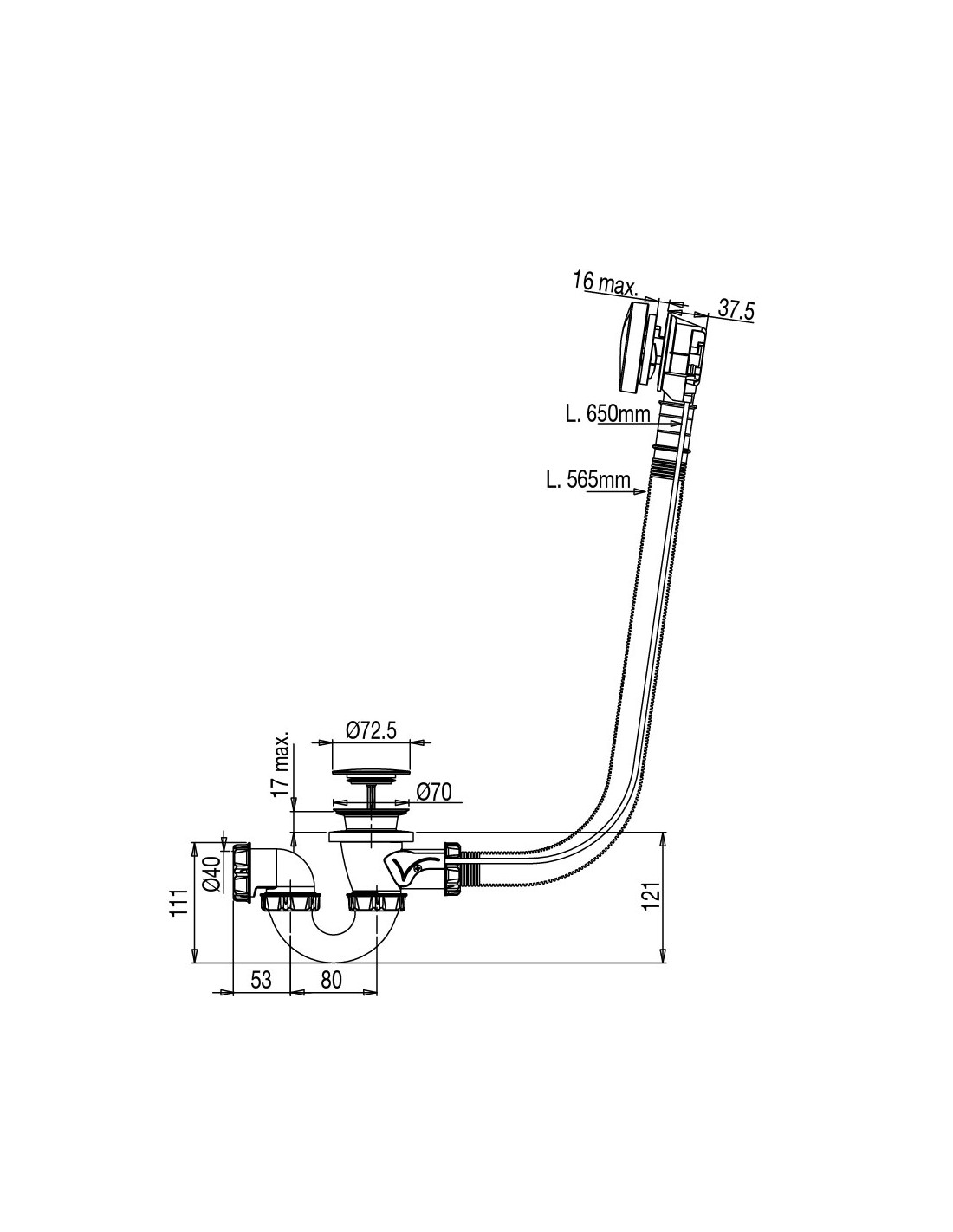 360 ° swivel outlet, overall dimensions under bathtub 121 mm, easily removable trap for cleaning