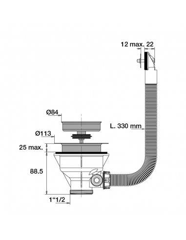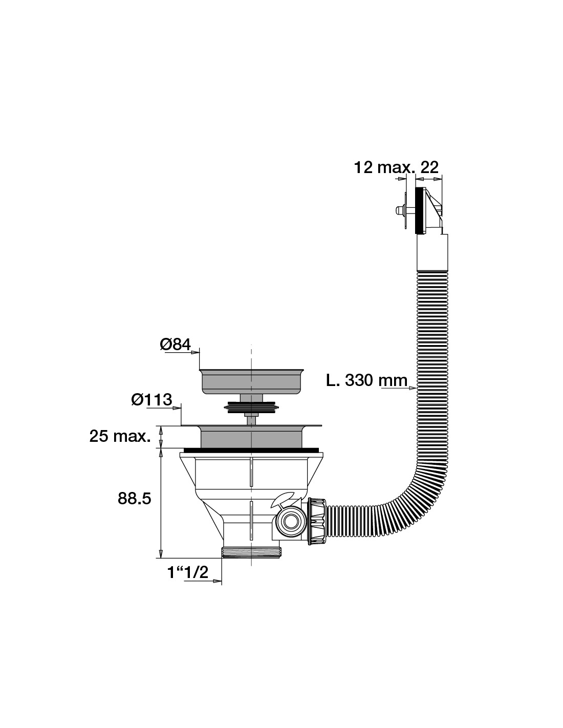 This waste is for overflow sink with 90 mm diameter hole. The flange has a diameter of 113 mm. Clamping is possible from 0 to 25 mm. The supplied screws are made of stainless steel. The basket has a diameter of 84 mm and the overflow is diameter 25 mm and length 330 mm. Two grids are included, one round and one rectangular, to adapt to all needs and desires. The flow rate of this waste is 33 l/min. The height under the sink is 88,5 mm.