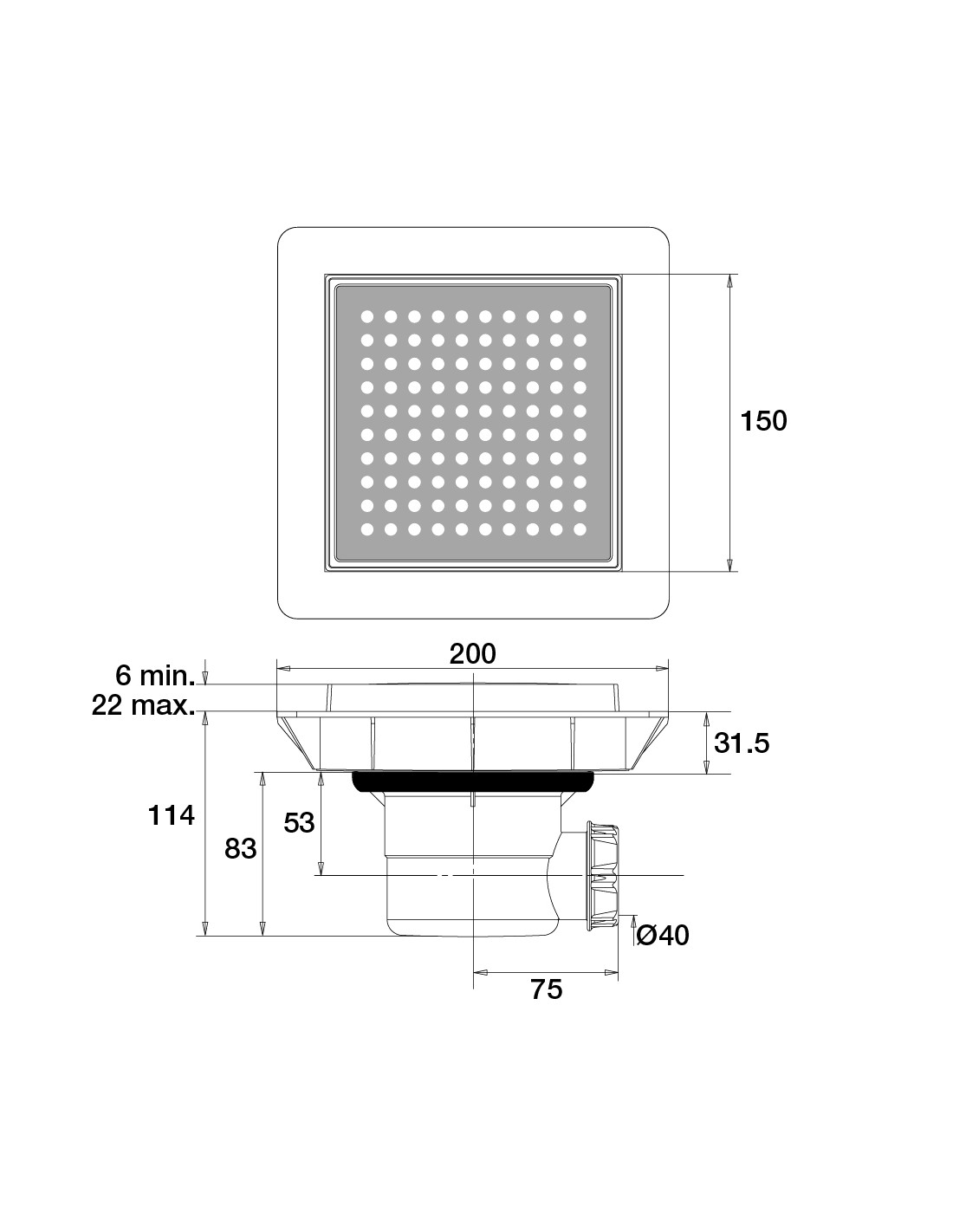The stainless steel design grid measures 150 x150 mm. This perfectly finished drain comes with a Butyl adhesive sealing strip.