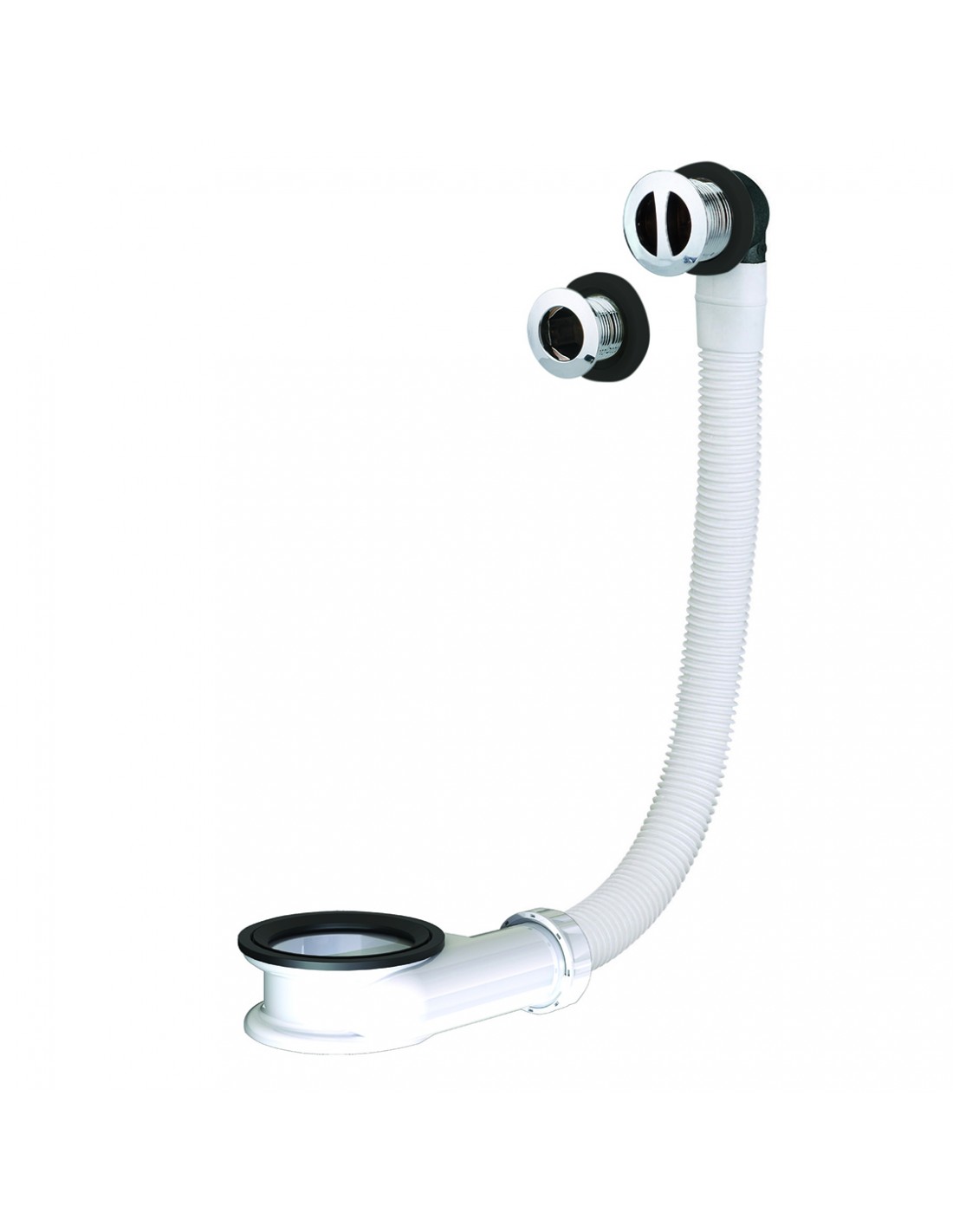 This universal overflow is complete and adapts to all washbasins thanks to its two flanges provided: a 24 mm diameter and a 30 mm diameter. The flanges also adapt in length since they can be cut up to 35 mm to adapt to the thickness of the equipment. The overflow pipe measures 330 mm and the white spacer connecting it to the drain is 33 mm height. The outlet is shifted and is convenient for the use of pull rod.