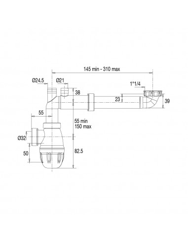 The pipe is adjustable in height from 78 to 173 mm, and the interaxis is also adjustable from 145 to 310 mm. The 32 mm diameter outlet offers a flow rate of 39 l/min.