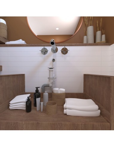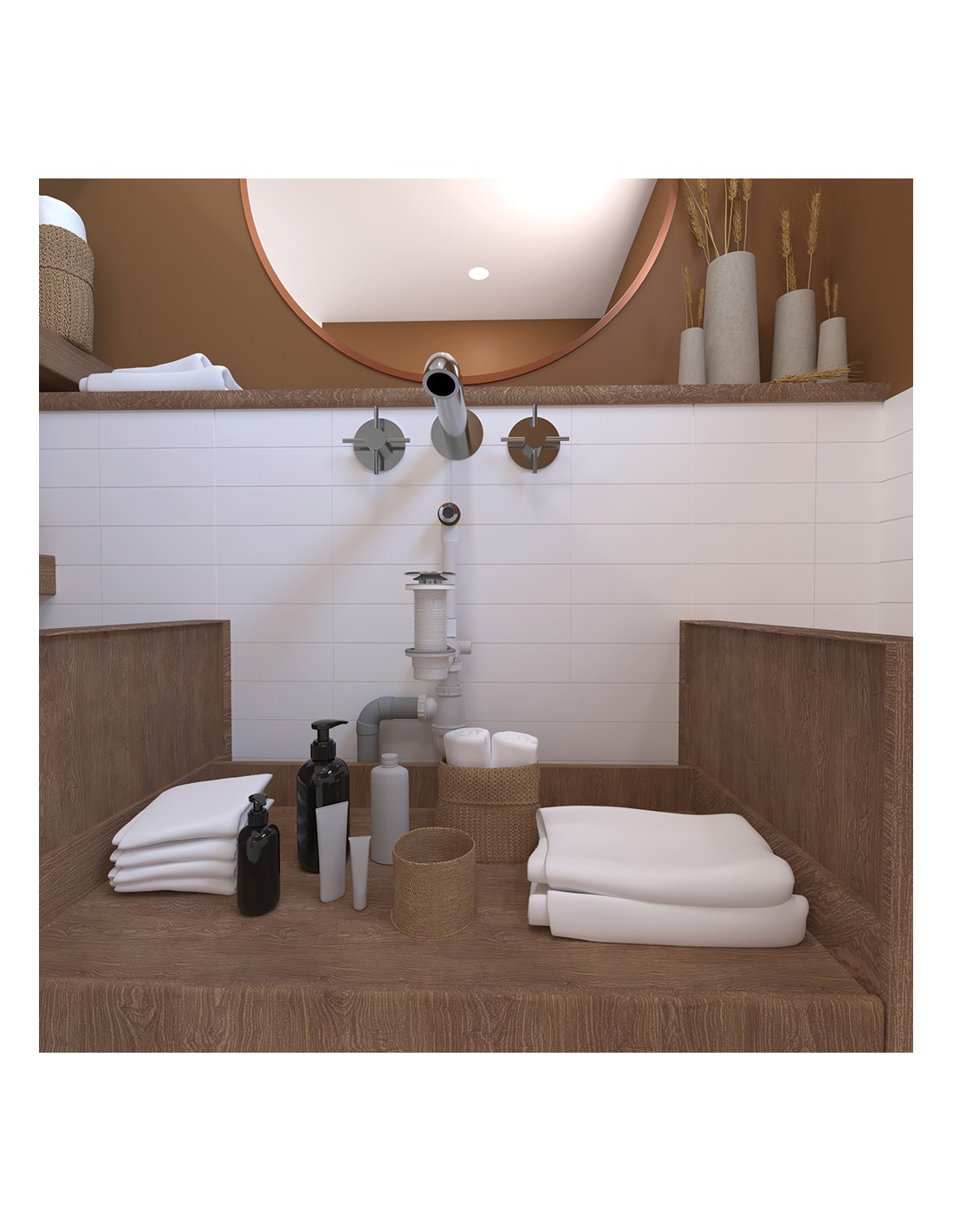 L'ensemble complet TBXP est composé d'une bonde de lavabo universelle, d'une tubulure ajustable et coupable à dimension, du siphon design Epure, d'une prise pour machine laver, de deux prises de trop plein et d'un siphon.